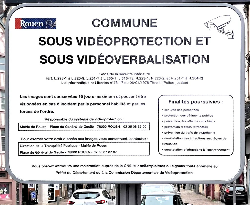 Conformément aux dispositions législatives et réglementaire en vigueur (articles L.223-1 à L.223-9, articles L.251-1 à L.255-1, L.616-13, R.223-1, R.223-2 et R.251-1 à R.254-2 et à la loi Informatique et Libertés n°78-17 du 6 janvier 1978 (Titre III Police Justice), la Ville de Rouen a installé un certain nombre de caméras de vidéoprotection pour assurer la sécurité des personnes et des biens.